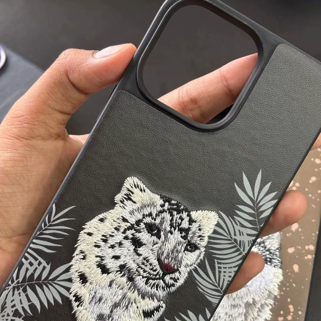 PULOKA – Tiger Embroidery Mobile Cover for iPhone 14 Pro Max – Sleek, Protective, Vegan Leather, Anti-Scratch – Black